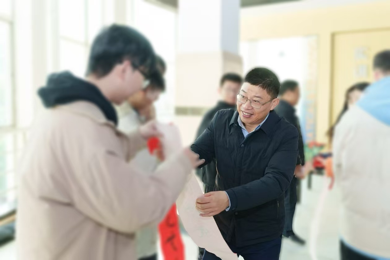 “墨香寄情?逐梦前行” 书法送祝福活动,学院邀请朱勇老师和书法协会的同学们一起给即将参加考研的学生写祝福,用手中的毛笔,饱蘸浓墨,书写下一句句励志的话语,送上最真诚的祝愿。活动结束后,老师们前去考研学生教室和宿舍送上祝福,预祝学生们考研顺利!