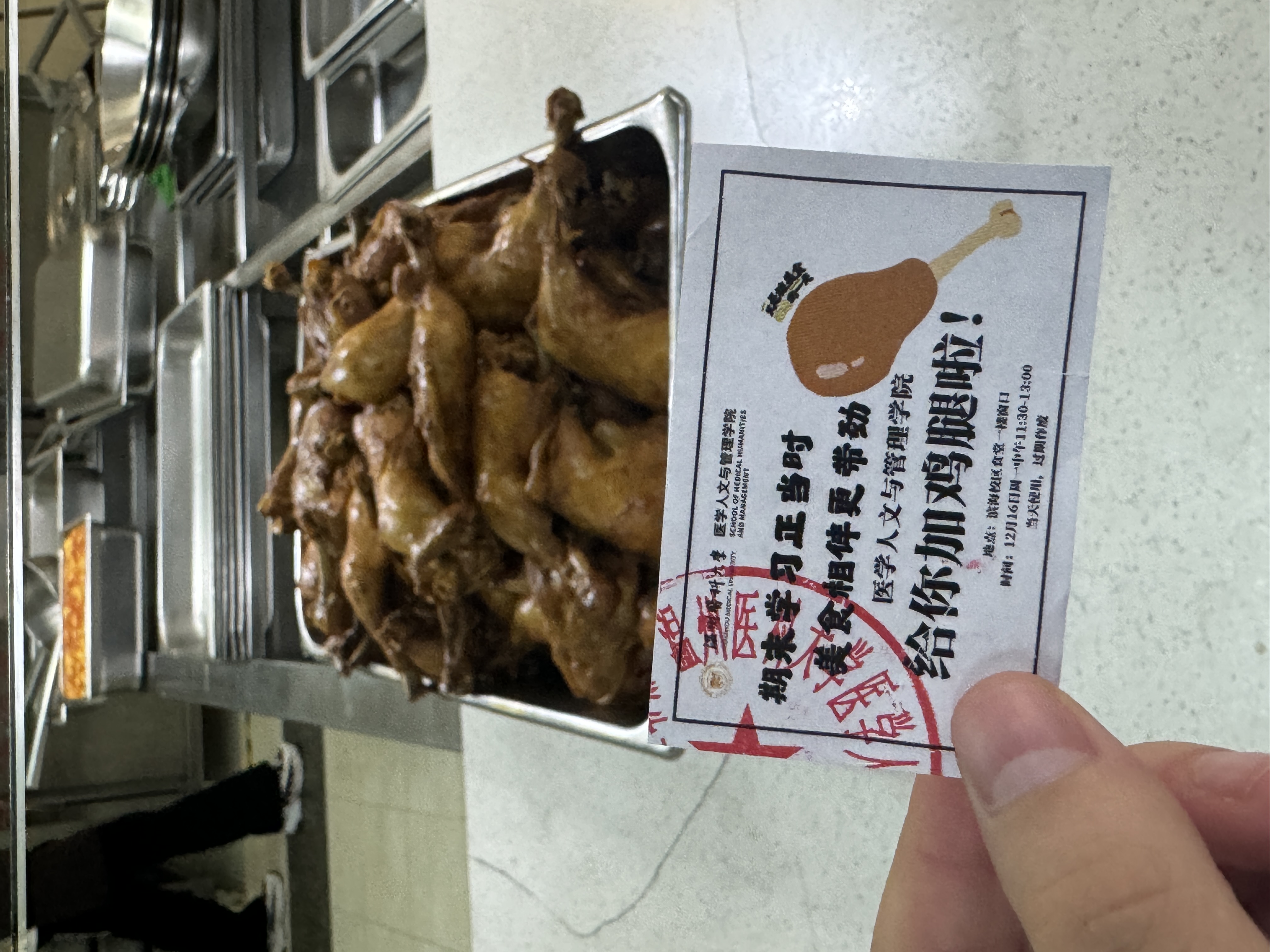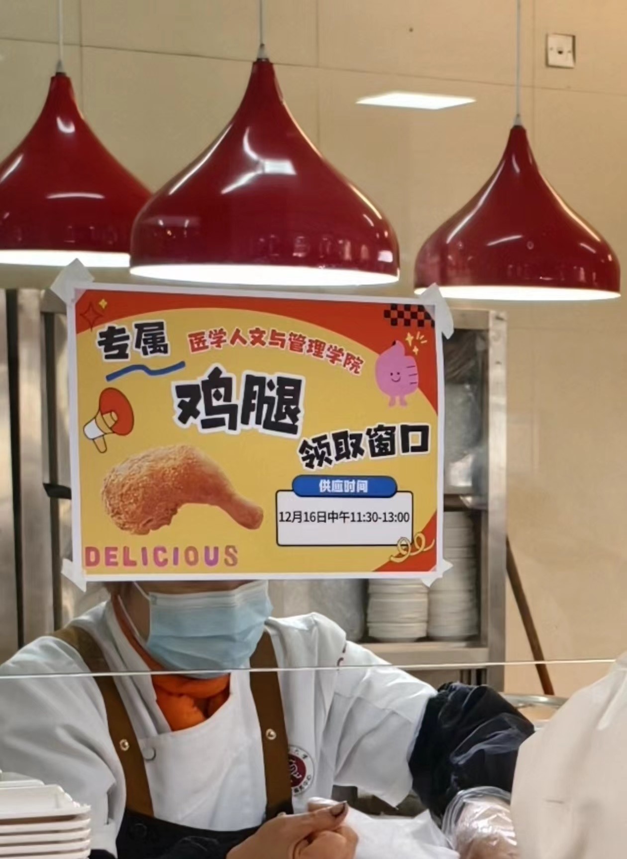 同期,学院在滨海校区食堂一楼开启期末“加鸡腿”活动。同学们持券排队,领取这份惊喜,笑容灿烂。在紧张的期末考试月,努力学习正当时,美食相伴更带劲。