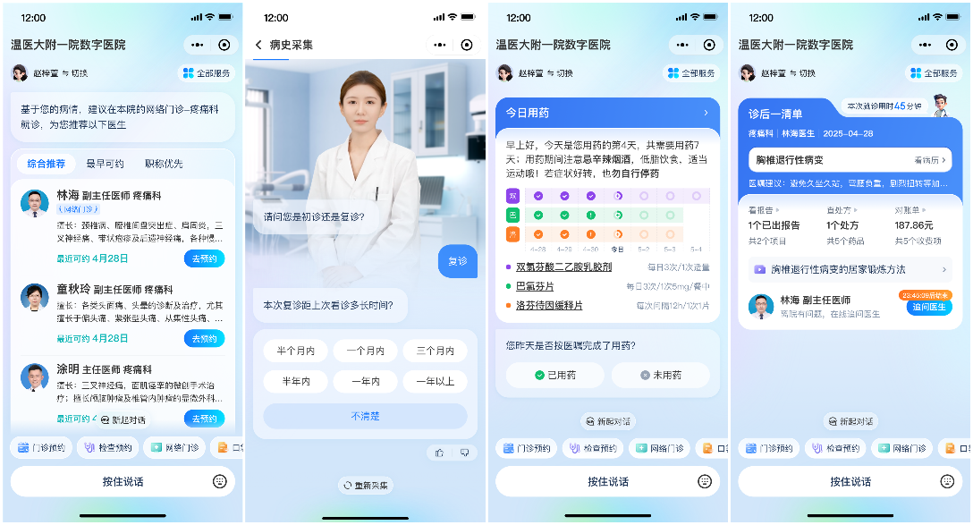 依托大模型技术底座,温医大附一院正从流程再造、模式创新等维度持续发力,推进“未来医院”的建设。目前,温医大附一院上线了一系列智能化系统,实现了门诊服务的全流程覆盖。