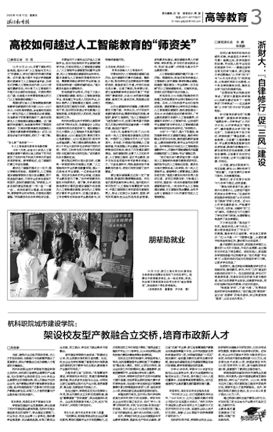 根据《浙江省人工智能赋能高校教育教学创新提质行动方案(2025—2027年)》,今年秋季学期起,全省高校均面向大一新生开设人工智能通识必修课程。在省教育厅的部署和推动下,高校实现新生人工智能通识课程全覆盖。这门课程的快速铺开,给各高校带来了哪些师资挑战?又将如何影响高校后续推动人工智能与教育教学深度融合?近日,记者走访省内多所高校,进行了一番了解。