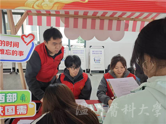 随着2026年大学生志愿服务西部计划招募的启动,市集中“西部计划与研究生支教团”的摊位格外热闹。2025年,温州医科大学共选拔20名优秀毕业生作为西部计划志愿者奔赴新疆、西藏、云南等地基层开展服务,另有前一年度10位志愿者选择续签,在岗服务人数创历史新高。往届毕业生志愿者选择到西部、到乡村、到基层志愿服务的赤诚初心,依然感染着在校学生,来到摊位咨询了解的青年学子络绎不绝。