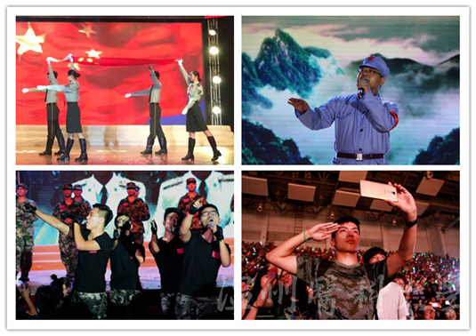 今年是中国人民抗日战争胜利70周年,为了让新生们能够铭记历史,此次迎新晚会特别加入了爱国主义教育元素。晚会精心设计的互动环节“开门大吉之我爱你中国”,收录近十首著名的红色歌曲,吸引师生们听歌识曲,竞相猜测;各曲由学校老师倾情演唱,带领同学们走进红色文化。校国旗护卫队的队员们则带来一曲《军姿颂·光辉礼赞》,他们衣装齐整、步调一致、慷锵有力,尽显军人风姿,当五星红旗飞扬而起,观众们难抑激动的心情,报以热烈的掌声。