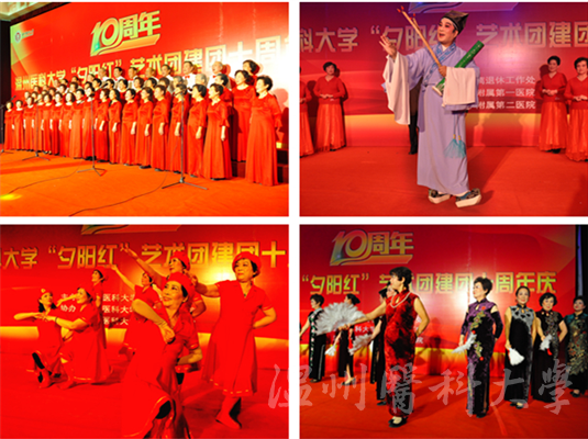 “夕阳红”艺术团是我校爱好文艺的离退休教职工组建的一个业余文艺团体,为离退休教职工打造了一个“老有所为、老有所乐、老有所学”的平台,已成为医大离退休教职工“文化养老”的重要舞台。本次十周年庆由校离退休工作处主办,附属第一医院、附属第二医院协办,丰富了离退休教职工的娱乐生活,增进了老同志之间的友谊,体现了学校对离退休同志的关爱。