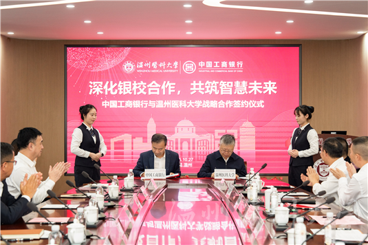 10月27日下午,温医大与中国工商银行股份有限公司温州分行在同心楼三楼会议室举行战略合作协议签约仪式。中国工商银行浙江省分行党委委员、副行长聂晶,温州分行党委书记、行长章晓仑,我校校长李校堃出席会议。