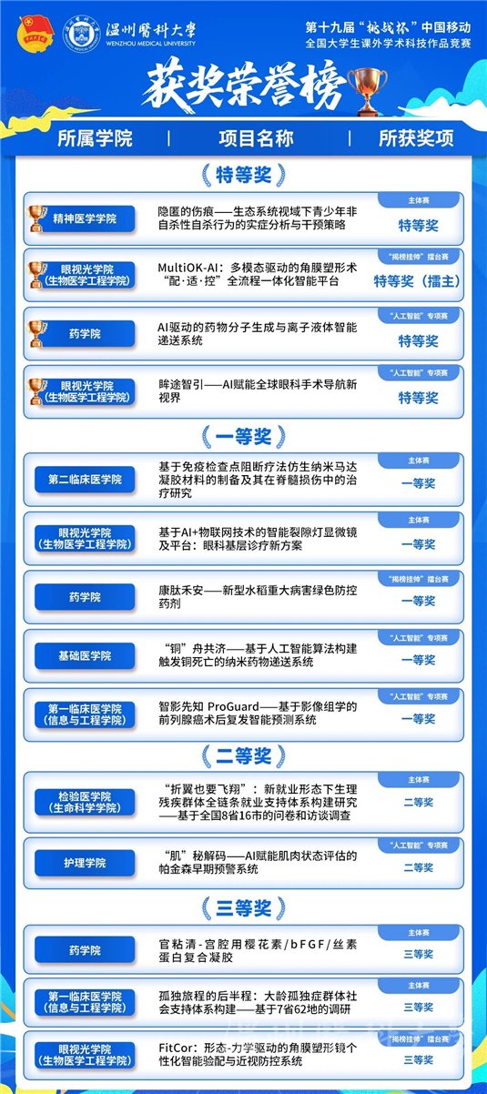 在今年“挑战杯”竞赛中,我校参赛团队取得新突破!第九次捧起优胜杯,共获国家级奖项14项,其中特等奖4项,首获“擂主”(全国第一)在主体赛获特等奖1项、一等奖2项、二等奖1项、三等奖2项在“揭榜挂帅”擂台赛获特等奖(擂主)1项、一等奖1项、三等奖1项在“人工智能+”专项赛获特等奖2项、一等奖2项、二等奖1项。