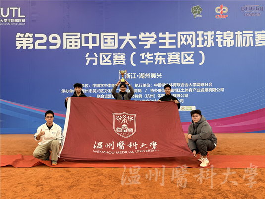 第29届中国大学生网球锦标赛分区赛(华东赛区),共有33所高校,近300名运动员参赛。徐鑫老师带领我校第一临床医学院(信息与工程学院)陈家瑞、郑文骏、第二临床医学院宋维龙、药学院董洪慈等同学在球场上奋勇争先、通力合作,凭借稳定的发挥与默契的配合,获男子团体第二名。