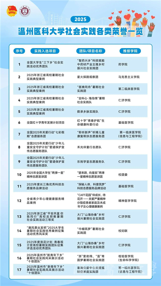 “浙”里实践,青春答卷。近日,团省委、省委宣传部、省教育厅、省学联公布了2025年浙江省高校暑期社会实践典型案例遴选结果。我校4支团队的优秀案例成功入选,入选数量位居全省高校前列,展现出温医青年学子服务社会的担当作为。