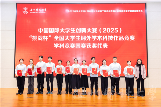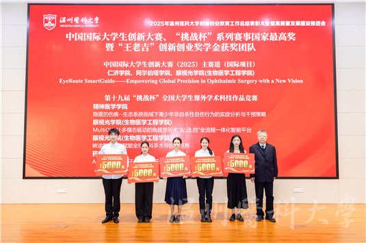 大会表彰了我校在各类创新创业赛事中涌现出的先进典型。2025年温州医科大学创新创业“大学生十佳人物”、创新创业教育工作优秀导师、首批“大学生创新创业名师工作室”、创新创业教育工作优秀学院及优秀示范基地、中国国际大学生创新大赛及“挑战杯”系列赛事国家最高奖获奖团队,以及“王老吉”创新创业奖学金获奖团队代表分批上台领奖。校领导为获奖代表颁发了荣誉证书与奖牌。