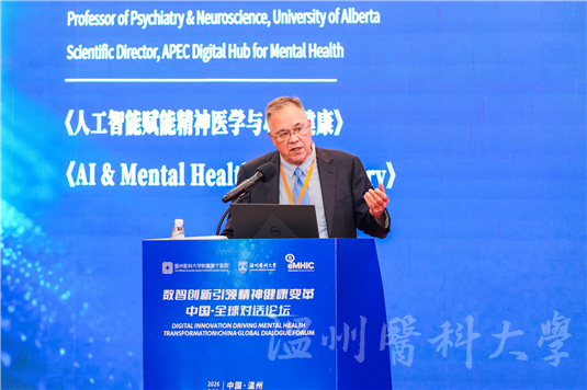 在主旨报告环节,中外专家围绕“数智创新”展开了高水平的学术碰撞。国内外专家分别就人工智能在心理健康领域的应用、数字心理健康的新政策与新战略、全球精神医学发展趋势等前沿课题作分享。