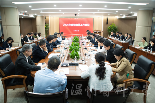 4月16日下午,学校2026年统战工作会议在茶山校区同心楼四楼会议室召开。校领导金焕民、章成斌、陈乃车、郑飞中出席会议,学校统一战线工作领导小组成员、专项协调机制工作组成员及各民主党派、统战团体负责人共50余人参加会议。