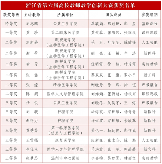 4月25日,浙江省第六届高校教师教学创新大赛决赛圆满落幕。我校(含仁济学院)共荣获特等奖1项、一等奖1项、二等奖6项、三等奖7项,学校取得优秀组织奖,充分彰显学校在教学创新实践与教师专业发展领域的实力与成果。其中,公共卫生学院刘志鹏老师获基础课程赛道特等奖。