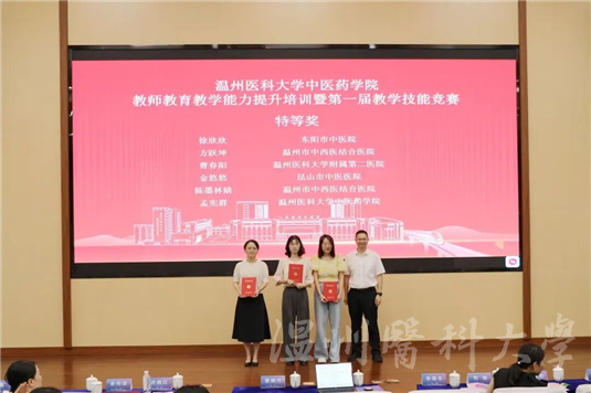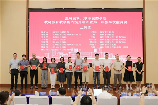 活动在颁奖仪式中圆满落下帷幕,经过评委们的认真评审,来自瑞安市人民医院的郑舒心等15名老师获得教学技能竞赛二等奖、温州市中心医院的翁金月等10名老师获得教学技能竞赛一等奖、东阳市中医院的林欣欣等6名老师获得教学技能竞赛特等奖。在颁奖环节,由温州医科大学中医药学院党委书记刘瑜、东阳市中医院院长王超为获得竞赛二等奖的选手颁发荣誉证书,温州医科大学教学发展中心主任金伟琼、东阳市中医院党总支书记许钢红为获得竞赛一等奖的选手颁发荣誉证书,温州医科大学教务处处长李章平为获得竞赛特等奖的选手颁发荣誉证书。