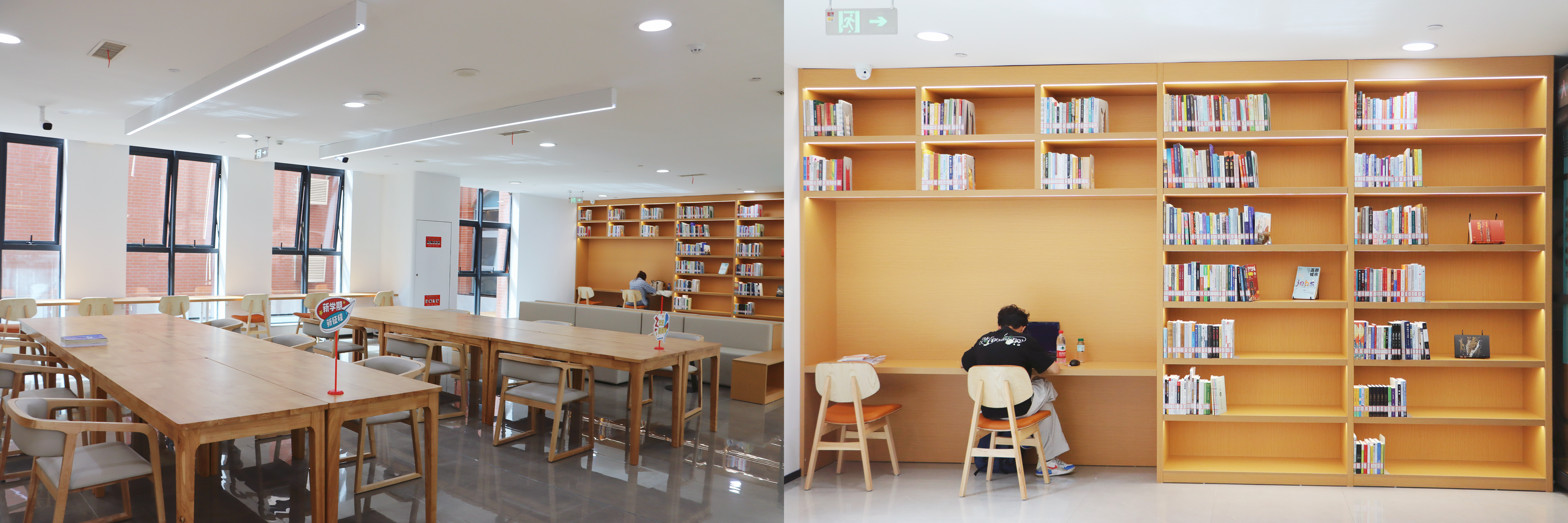 休闲阅读区。巧妙利用自然采光,设有靠窗座位、嵌入式书架与舒适沙发等,辅以柔和灯光和绿植点缀,氛围温馨宁静、轻松惬意。两侧的医大朗读亭配备专业隔音环境与高保真录音设备,提供丰富朗读资源及名家示范,可沉浸式享受声音创作体验。