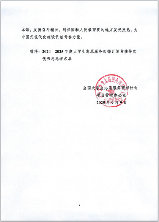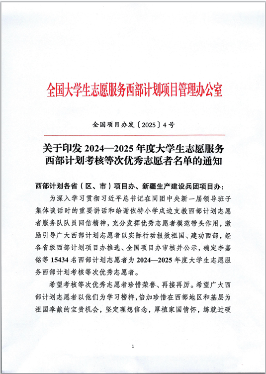近日,全国大学生志愿服务西部计划项目管理办公室发布《关于印发2024-2025年度大学生志愿服务西部计划考核等次优秀志愿者名单的通知》(全国项目办发〔2025〕4号),我校西部计划志愿者方宏源、张丽涛两位同学荣获“全国大学生志愿服务西部计划优秀志愿者”。