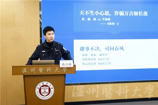 北岙派出所的林彬琳警官从安全委员的自身定位出发,凭借数据支撑,通过典型案例警示,指导安全委员们学会识别各类陷阱,有效守护自身及同学们的“钱袋子”。