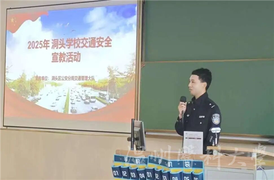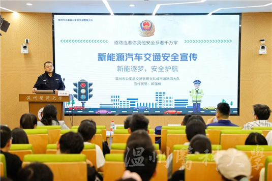 温州市公安局交通管理支队城市道路四大队八中队副中队长邱强楠以发生在大学城的典型交通事故案例为切入点,重点讲述了正确佩戴安全头盔和系牢安全带的重要性,详细阐述了危险驾驶的陋习、事故处理流程及汽车盲区的识别方法,让安全委员再次深刻认识到学习交通知识的必要性、遵守交通规则的重要性。