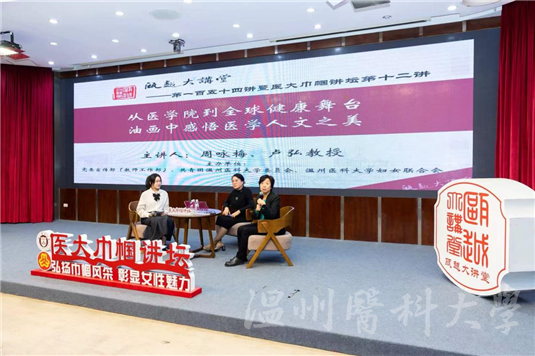 10月25日晚,世界银行前高级官员、全球胜任力导师周咏梅和首都医科大学附属北京朝阳医院原眼科主任、现任国家卫生健康委书法美术家协会理事卢弘做客瓯越大讲堂第一百五十四讲暨医大巾帼讲坛第十二讲,分别为线下师生带来了题为《从医学院到全球健康舞台》和《油画中感悟医学人文之美》的主题讲座,引领听众进入了一场医学与全球健康和人文艺术的跨领域对话。