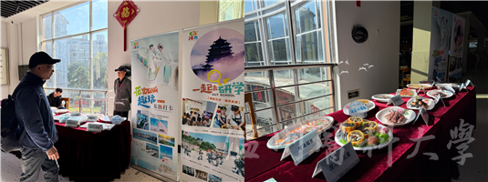 盐水剑虾、葱油淡菜、鳗干芹菜、红烧午鱼、紫菜丸拼肉丸……十余道“百岛十二鲜”核心菜品整齐排列,新鲜海产散发出诱人的香气,吸引师生们纷纷驻足排队。他们手持餐盘,穿梭于各个餐台之间,尽情享受这场“鲜味盛宴”。餐厅入口处还专设了洞头文旅展示台,同步展示特色菜品与景区风貌,通过“味觉+视觉”的双重呈现形式,生动传播地方旅游文化。