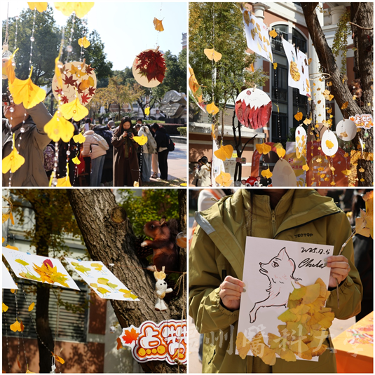 打卡区设计别具匠心,落叶与麻绳、木棒等搭配制成风铃,暖光串灯与错落的落叶装饰交相辉映,落叶拼贴的银杏伞、立体相框等装置,搭配松软落叶堆与枯枝,成为师生争相合影的 “网红地标”,大家纷纷赞叹校园创意与自然之美。