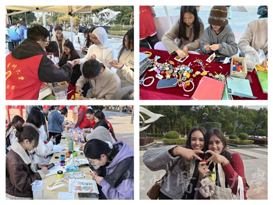 此外,手工义卖与趣味互动环节中,志愿者们带领师生一同制作落叶书签、环保不倒翁、彩绘帆布袋并进行义卖,国际留学生也积极参与其中。小物件成为联结温格两地情谊的纽带。