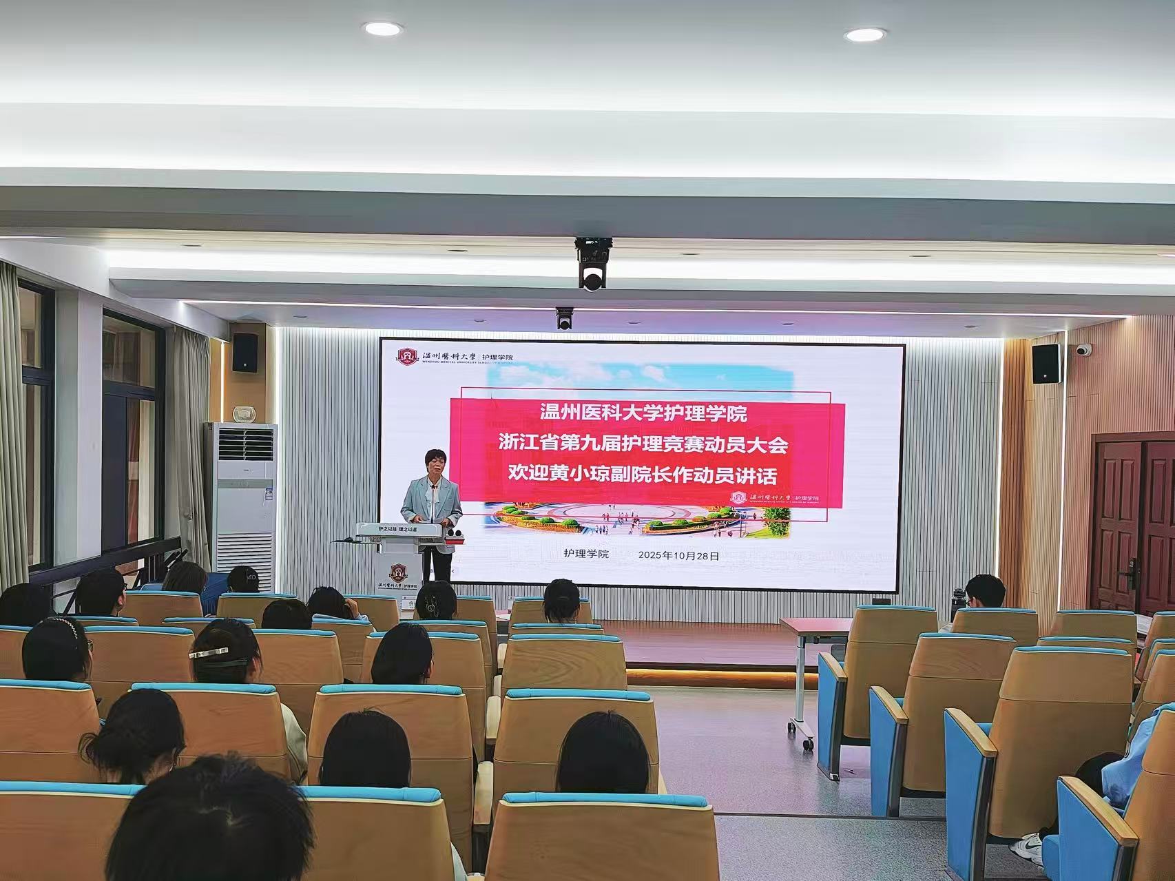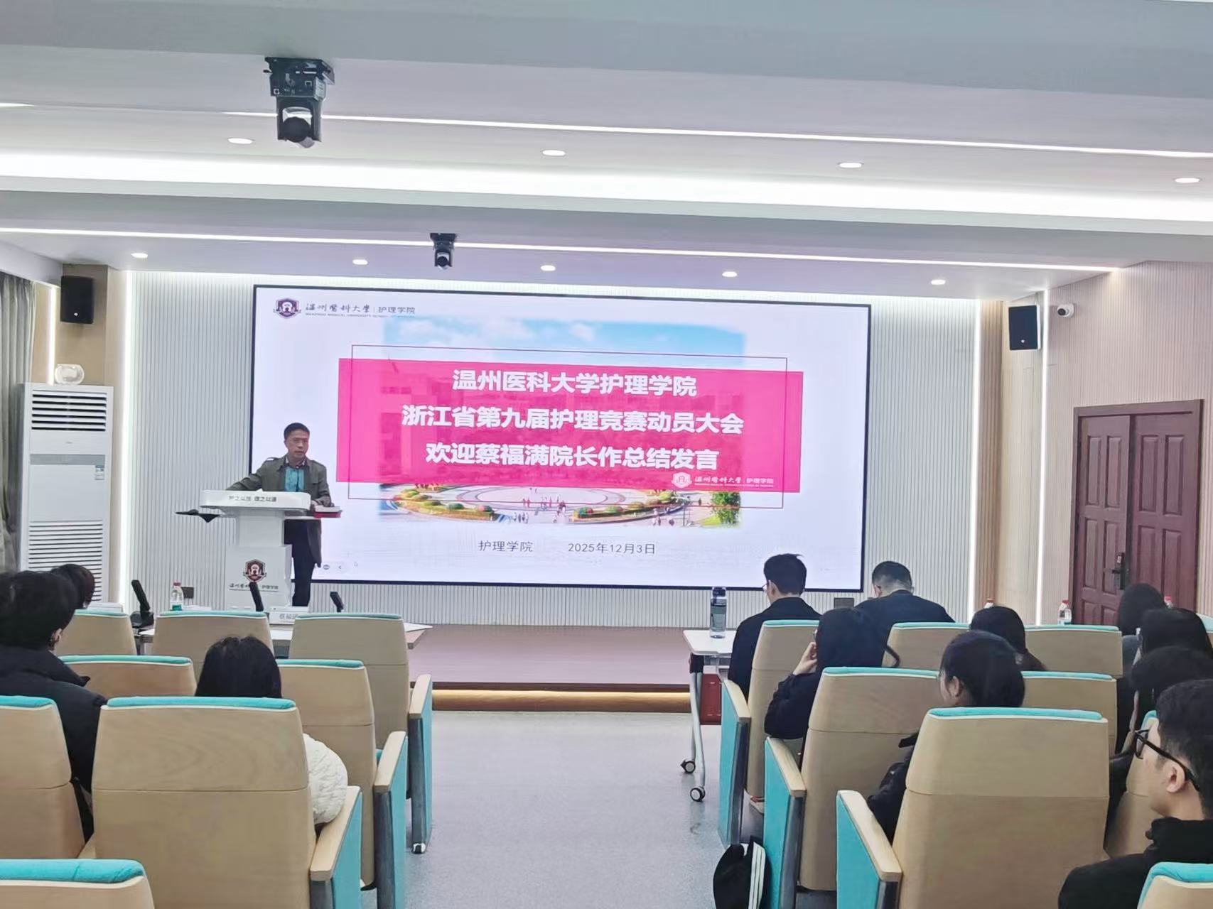 在赛事筹备初期,学院组织召开动员大会。会上,院长蔡福满鼓励同学们积极备赛,以饱满的热情和昂扬的斗志投入到训练中,在竞赛中展现温医护理学子的风采。副院长黄小琼介绍了本次竞赛的意义、目标要求。