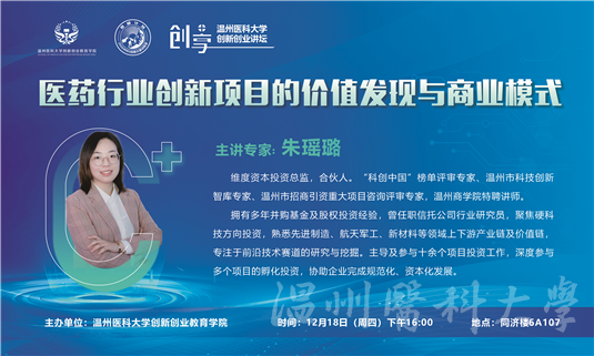 12月18日,创新创业教育学院在在同济楼6A107举行“登峰计划”2026年WMU创新大赛训练营暨创享+专题讲座。本次活动邀请维度资本投资总监、合伙人朱瑶璐以“医药行业创新项目的价值发现与商业模式”为题展开分享。各学院团委书记、学科竞赛重点团队师生参加活动。
