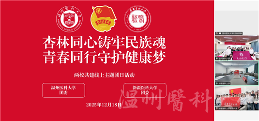 为铸牢中华民族共同体意识,凝聚医学生守护健康的青春力量,12月18日下午,温州医科大学与新疆医科大学以线上会议形式联合举办“杏林同心铸牢民族魂,青春同行守护健康梦”主题团日活动。两校团委书记以及师生代表跨越三千公里云端相聚,共同参与此次活动。