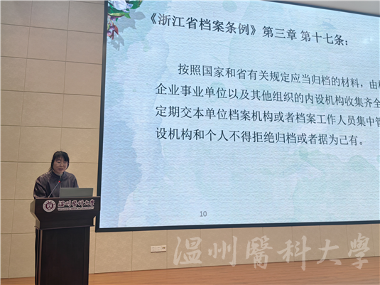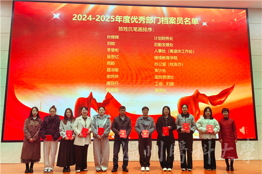 我校档案工作稳步推进、成效显著,离不开部门档案员们的履职尽责、务实笃行,为进一步激发全体部门档案员的工作热情和责任感,档案馆授予叶辉辉等9名同志优秀部门档案员称号,并为其颁发证书。获奖同志代表夏淑敏上台发言,分享了档案收集整理工作中的经验做法,建议各位档案员加强交流、相互借鉴,不断提高服务意识和规范意识。