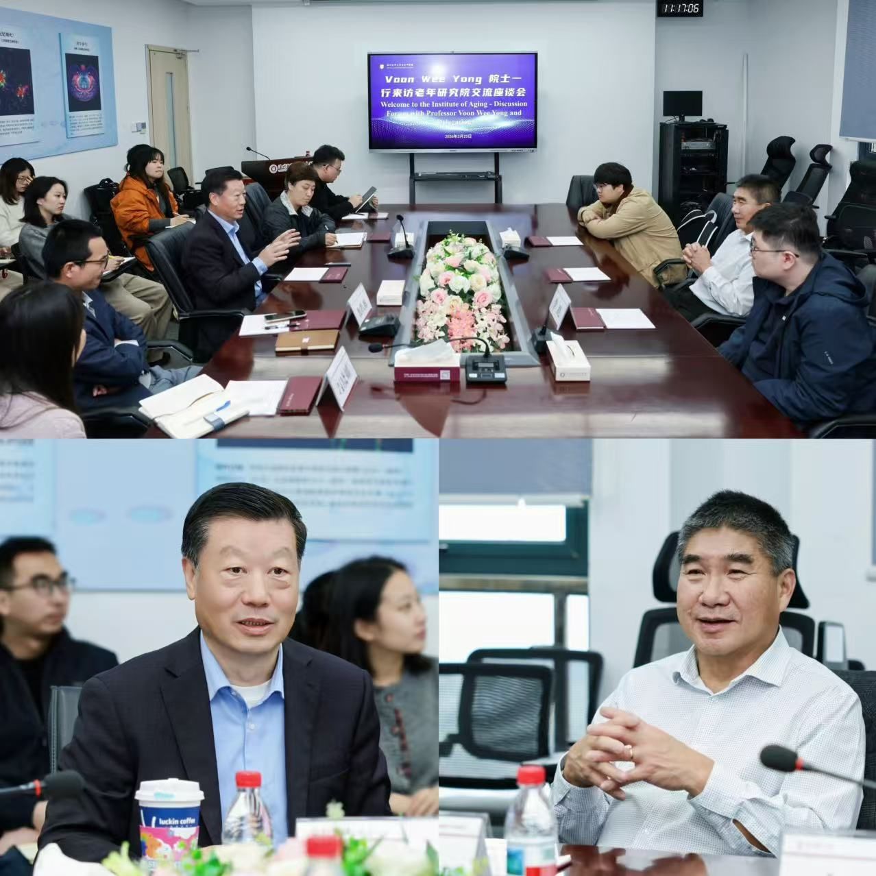报告结束后,Voon Wee Yong一行访问了老年研究院,与宋伟宏院士及我院师生代表交流座谈。宋伟宏围绕老年研究院及老年医学学院的建设发展,系统介绍了我院研究方向、人才队伍、科研成果与研究生培养等基本情况,并展示了特色项目——中国健康老龄化防治阿尔茨海默病研究计划(HAPCAD)。Voon Wee Yong高度评价了老年研究院在老年医学领域的快速发展和持续深耕,并对未来深化合作与交流表达了积极期待。