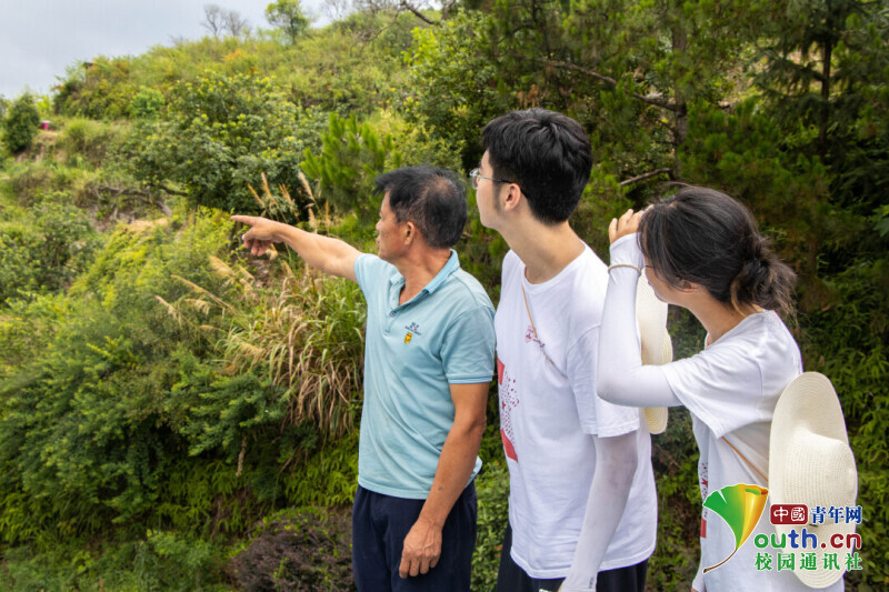 图为鳌洋村村书记魏为军为实践团成员讲解该村杨梅种植情况。中国青年网通讯员 柳毅品 摄