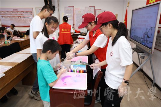 图为温州医科大学巾帼筑梦暑期社会实践团成员协助小朋友完成水拓丝巾