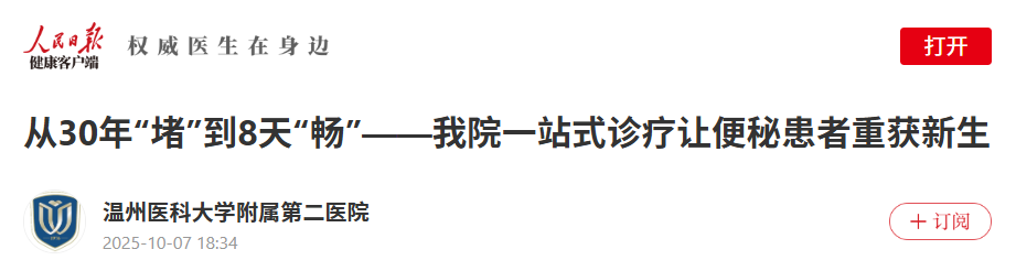 “下一步,我们将把远程会诊平台延伸到县域医院,让基层患者在家门口就能享受MDT服务。”王中林说,团队目标是在未来几年内把浙南闽北顽固性便秘转诊率和手术并发症显著降低,为更多患者点亮“畅快人生”的希望之光。