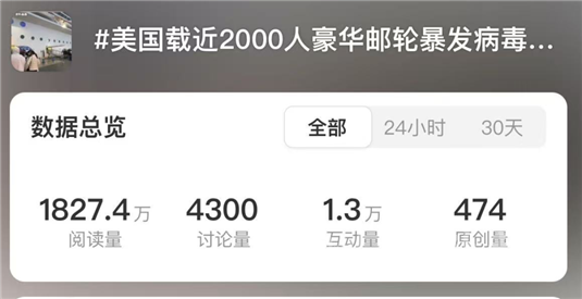 日前,美国皇家加勒比旗下邮轮“海洋旋律号”爆发诺如病毒疫情,船上近百人感染。美国疾病控制与预防中心(CDC)披露,截至10月1日,1874名乘客中有94人出现腹泻、呕吐等感染症状,883名船员中亦有4人染病。10月3日,这一事件迅速冲上微博热搜,引起广泛讨论。
