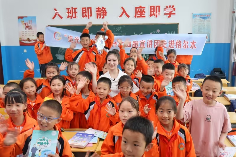 温州医科大学药学院“追光”科学家精神红细胞宣讲员在青海格尔木小学宣讲生长因子故事。