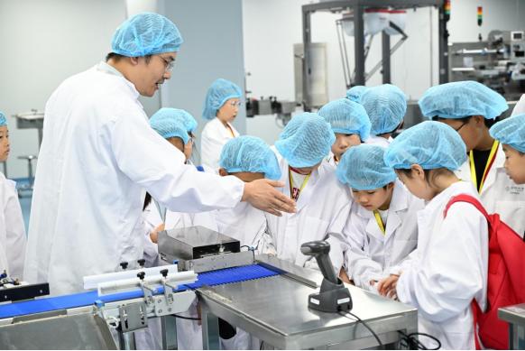 温州医科大学药学院实验室开放日组织小学生参观药物生产车间。