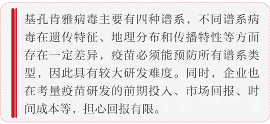 从产业层面看,国内传统疫苗企业对新型疫苗的研发投入往往基于多重考量,特别是市场需求与经济效益方面。首先是前期投入,仅Ⅲ期临床试验就要动辄数亿元,企业投入会非常谨慎。其次是市场回报,基孔肯雅热大多发生在热带和亚热带地区,在我国的发病率更是远远低于流感等,开发疫苗的经济价值有限,以致不少企业仍在观望。再次是时间成本,若走传统研发路线,疫苗研发成功最快也需要5~7年,届时市场可能已被进口疫苗所挤占,疫苗企业将陷入进退两难的境地。