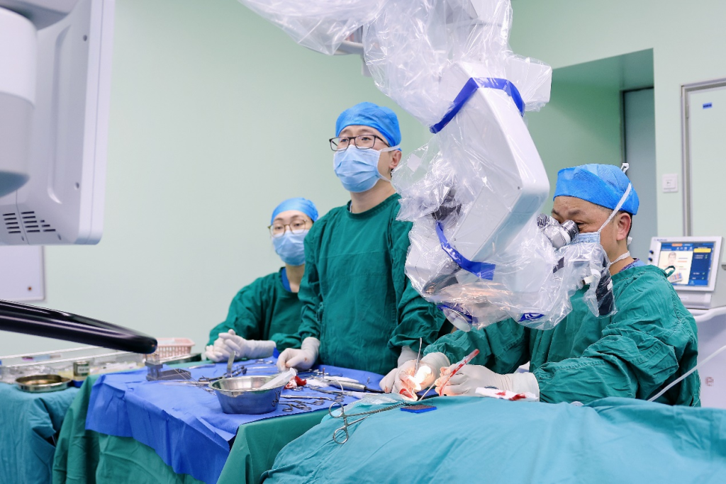 黄益灯(右一)用显微镜给患者做手术。医院供图