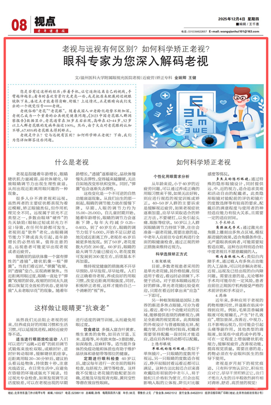 维持视觉健康的措施离不开尽早预防、尽早发现、尽早处理。人们应正确看待老视,养成良好的用眼习惯,改变近距离用眼强度,同时,积极矫正老视,这样才能给自己一个清晰的“视”界。