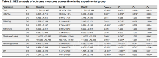 研究团队将40名参与者随机分配到使用该app的干预组或未干预的对照组,随访30天。主要结局包括眼表疾病指数(OSDI)评分、眨眼率(BR)、不完全眨眼(IB)百分比、眼保护指数(OPI)和泪膜稳定性。30天后,干预组在眨眼行为和眼球参数方面有显著改善,而对照组则无显著变化。广义估计方程显示,训练时长、OPI、BR和性别与OSDI分数的变化独立相关。
