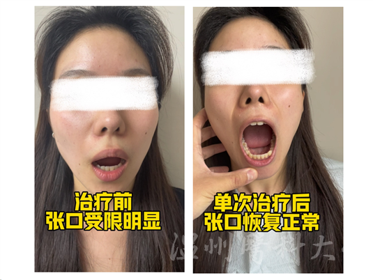 当时,该患者柳女士(化名)的症状比较严重,张口严重受限(不足两指)并伴有显著疼痛,连日常进食都变得异常困难。