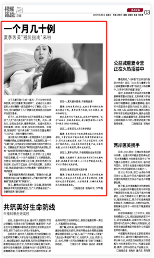 为了在夏天能“白成一道光”,不少女性纷纷选择医美,却往往遭遇“美白陷阱”。记者近日从温州医科大学附属第一医院医美中心了解到,仅在一个月内,他们就接诊了几十例盲目医美导致出现各种并发症的患者。