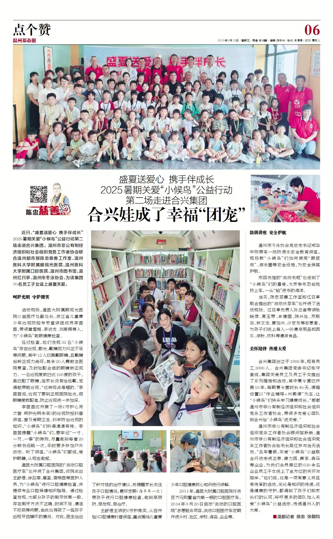 近日,“盛夏送爱心 携手伴成长”2025暑期关爱“小候鸟”公益行动第二场走进合兴集团。温州市非公有制经济组织和社会组织党务工作者协会联合温州都市报陈忠慈善工作室、温州医科大学附属眼视光医院、温州医科大学附属口腔医院、温州市图书馆、温州红日亭、温州市冬泳协会,为该集团70名员工子女送上盛夏关爱。