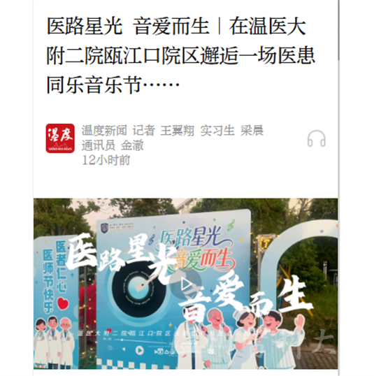 通过音乐节搭建的沟通平台,温医大附二院瓯江口院区不仅让医疗服务的温度突破了病房的围墙,让医患信任在旋律中悄然生长,更以音乐为媒介,将医院、患者与社会紧密联结,成为医社共建的一次有益探索。这种创新实践印证了优质的医疗服务,不仅需要精湛的医术,更需要用人文关怀架起心与心的桥梁。未来,温医大附二院瓯江口院区将继续以人文关怀为底色,在深化医患沟通、拓展医社共建的道路上谱写更多温暖篇章,推动医疗卫生服务形成“医院-患者-社区”三方联动的良性循环,迈向更高质量的整合型健康服务体系新台阶。