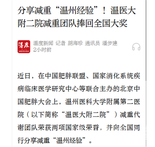 近日,在中国肥胖联盟、国家消化系统疾病临床医学研究中心等联合主办的北京中国肥胖大会上,温州医科大学附属第二医院(以下简称“温医大附二院”)减重代谢团队荣获两项国家级荣誉,并向全国同行分享减重“温州经验”。