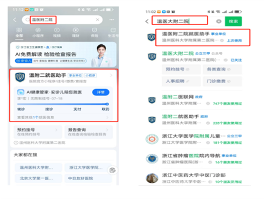 第一步: 支付宝/微信搜索【温医附二院】官方小程序进入医院就医助手服务主页