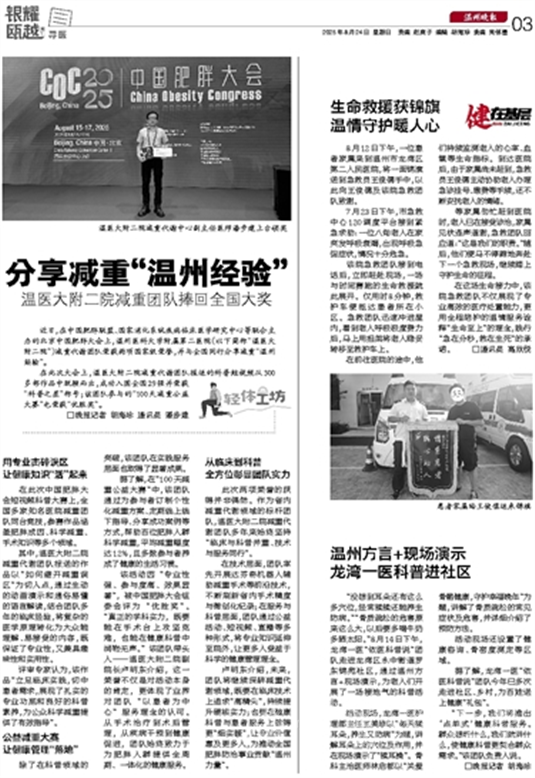 该活动因“专业性强、参与度高、效果显著”,被中国肥胖大会组委会评为“优胜奖”。“真正的学科实力,既要能在手术台上攻坚克难,也能在健康科普中润物无声。”该团队带头人——温医大附二院副院长卢明东介绍,这一荣誉不仅是对活动本身的肯定,更体现了业界对团队“以患者为中心”服务理念的认可。从手术治疗到术后管理,从疾病干预到健康促进,团队始终致力于为肥胖人群提供全周期、一体化的健康服务。