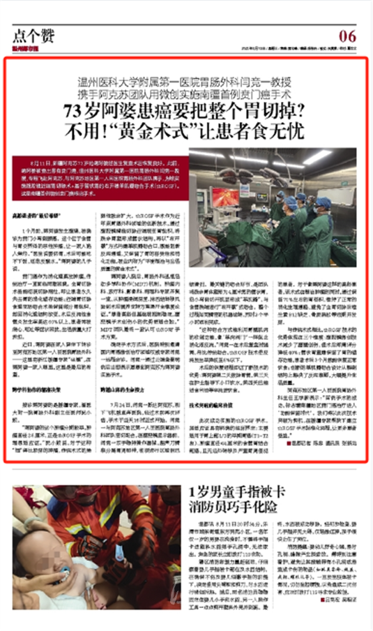 术后的恢复进程印证了新技术的优势:蒋阿婆第二天拔除胃管,第三天在护士指导下小口饮水,第四天已能进食米油等半流质饮食。