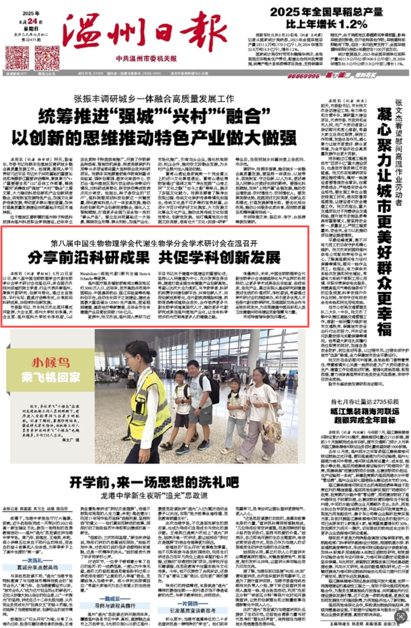 本报讯 (记者 缪眎眎) 8月22日至25日,第八届中国生物物理学会代谢生物学分会学术研讨会在温召开。来自国内外相关领域的院士学者、行业代表齐聚温州,聚焦代谢研究、创新与转化,通过主旨报告、平行论坛、圆桌对话等形式,分享前沿科研成果,共促学科创新发展。