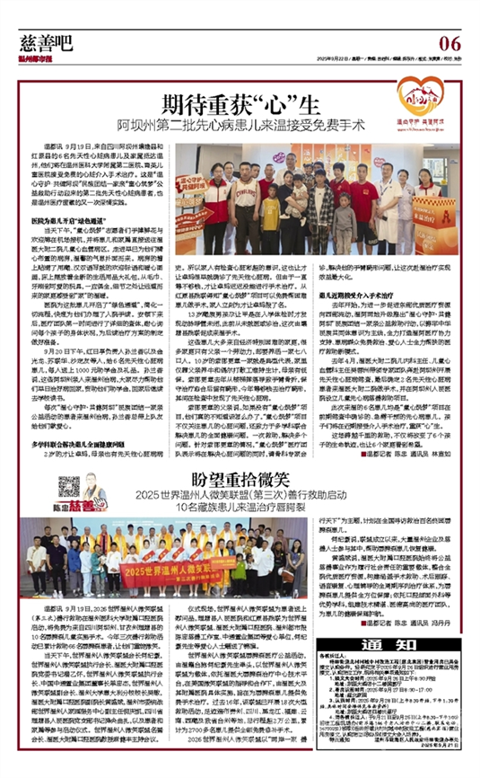 去年4月,温医大附二院儿内科主任、儿童心血管科主任吴蓉洲带领专家团队奔赴阿坝州开展先天性心脏病筛查,最后确定2名先天性心脏病患者来温医大附二院做手术,并在阿坝州人民医院设立儿童先心病慈善救助项目。