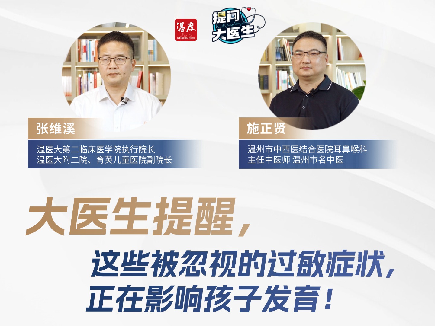 近日,第八期“提问大医生”访谈特别邀请到了温医大第二临床医学院执行院长兼温医大附二院、育英儿童医院副院长,儿童过敏与免疫科学科带头人张维溪,温州市中西医结合医院耳鼻喉科主任中医师、温州市名中医施正贤。两位嘉宾从过敏的发生机制、如何打断过敏进程、最新过敏治疗方法等方面,探讨到底该如何科学抗敏。